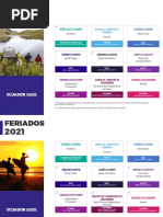 El ministerio de turismo difundió el viernes, 22 de noviembre de 2019, los calendarios de feriados para 2020 y 2021. Da click sobre los meses para obtener mas detalles. Sigue la página para estar al tanto de todo lo nuevo que se viene este 2021. Los calendarios también son compatibles con google docs y open office. Ecuador está incluido este año en el programa de visas de diversidad.