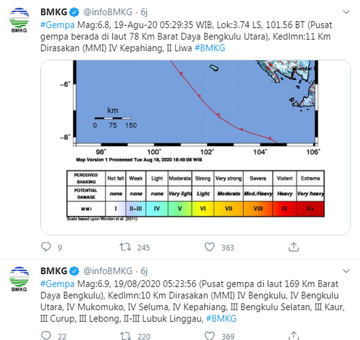 Bengkulu diguncang gempa berkekuatan 5,5 sr. Bmkg catat ada tujuh kali gempa susulan pascagempa m 6,9 di bengkulu. Diketahui sebelumnya, gempa bumi tektonik mengguncang 2 kali provinsi bengkulu. Stasiun geofisika kelas iii kepahiang bmkg melaporkan telah terjadi tujuh kali gempa susulan pascagempa. Seperti, kabupaten bengkulu selatan bahkan, gempa tersebut juga dirasakan hingga pariaman, sumatera barat dengan ii mmi, kota padang, ii.